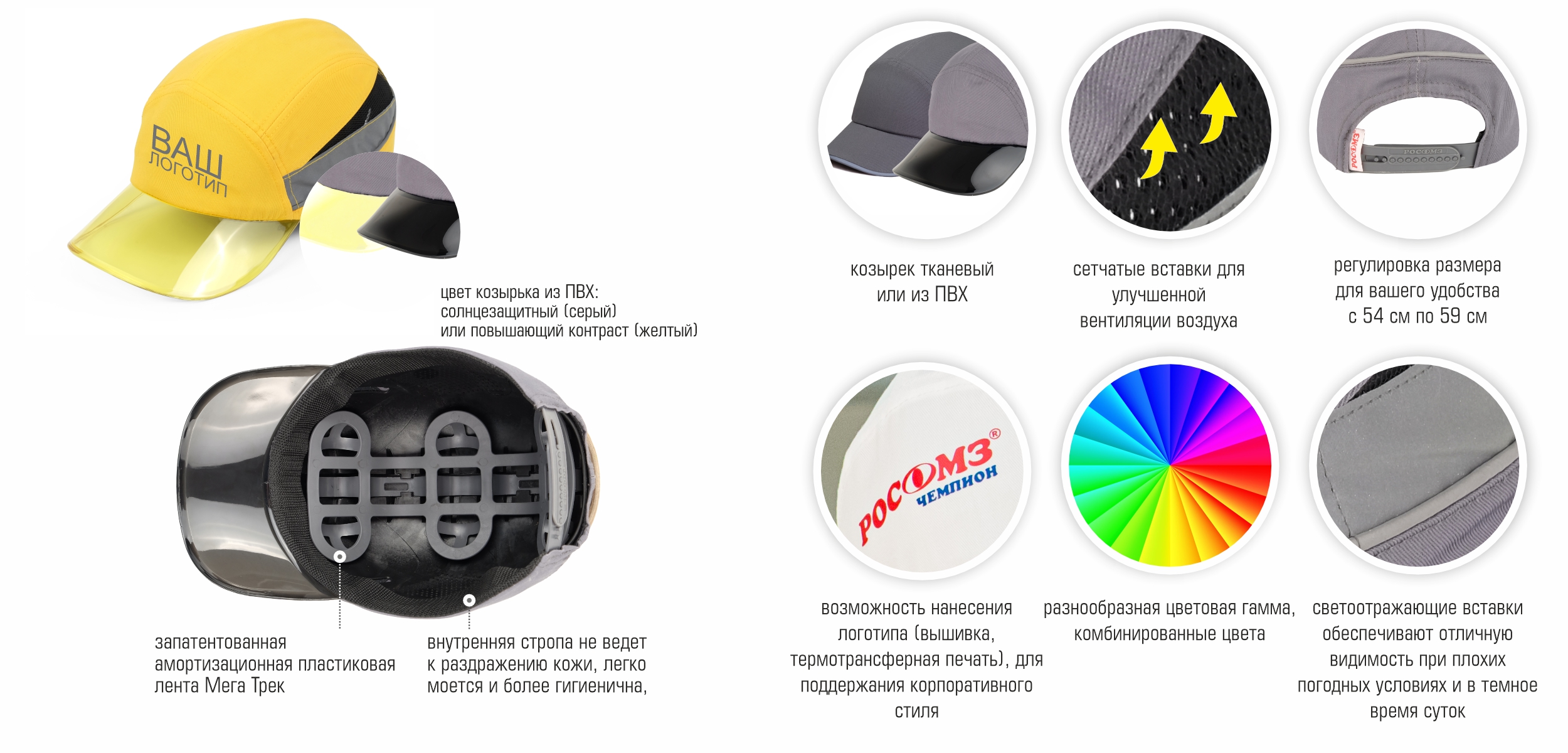 Специальная запатентованная конструкция, позволяющая использовать каскетку с другими СИЗ.