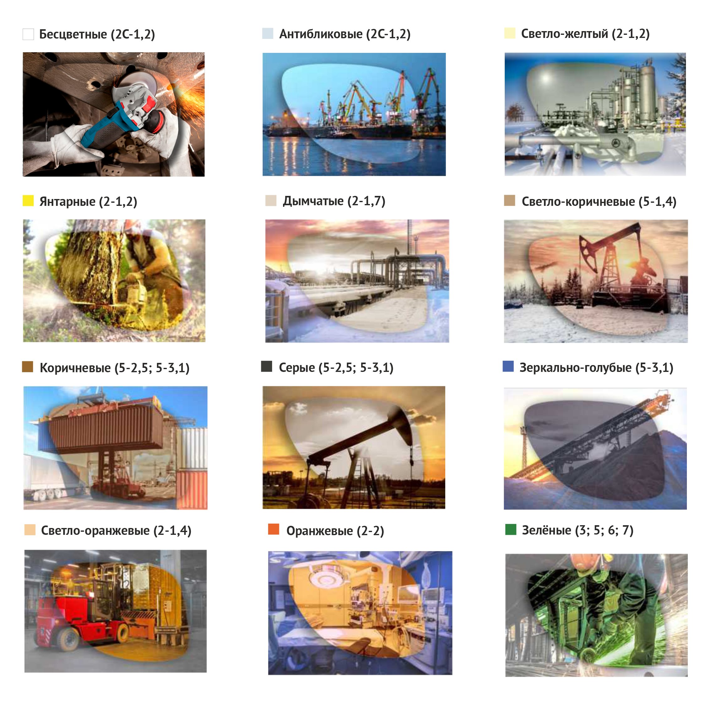 Янтарный (2-1,2) Контраст — светофильтр увеличивает контрастность в условиях плохой видимости, недостаточной освещенности на улице, в цехах и на промышленных площадках. Подходит для работ в ночную смену, снижает утомление глаз.